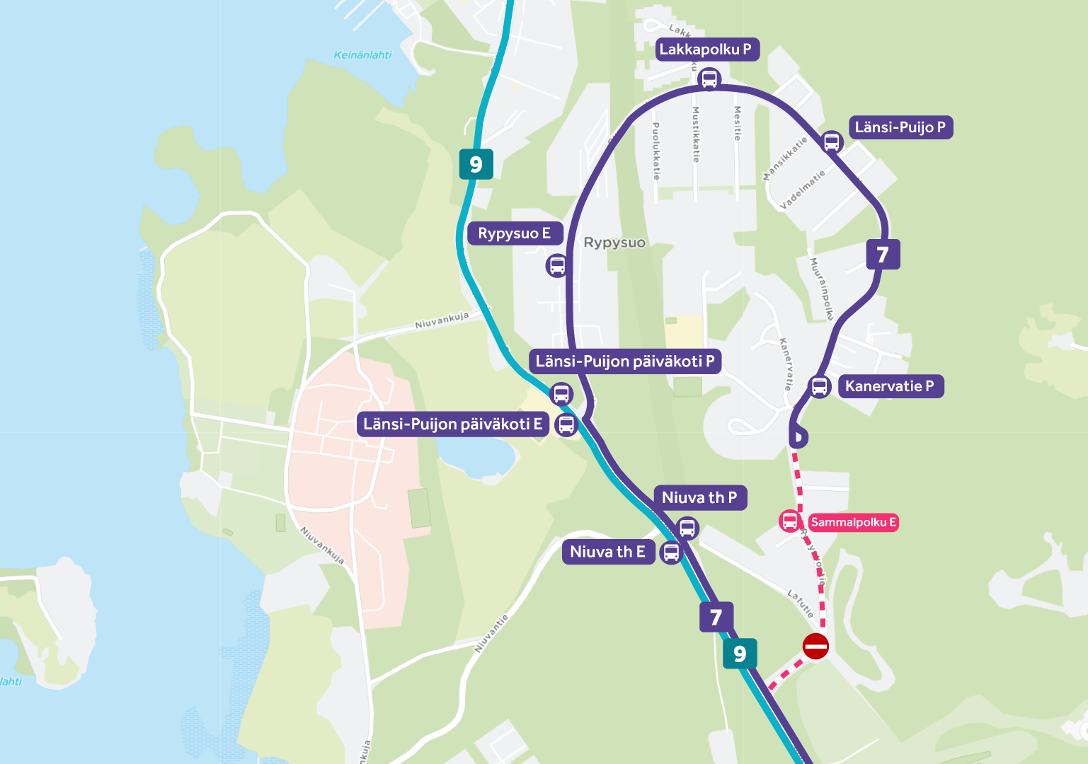 Linja 9 jättää Rypysuontien kokonaan liikennöimättä. Lähimmät pysäkit linjalla Länsi-Puijon päiväkoti sekä Niuva th.